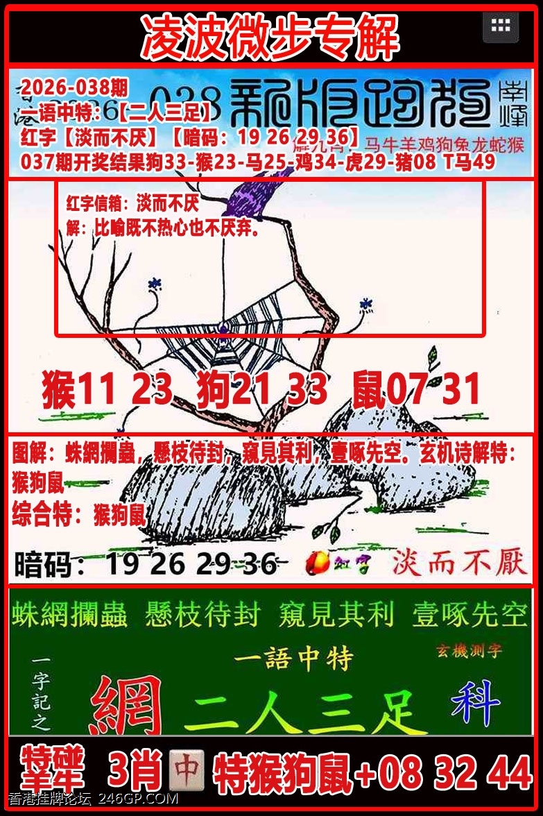 038期跑狗:【網】蛛網攔蟲,懸枝待封。窺見其利,壹啄先空。玄機測字:《科》